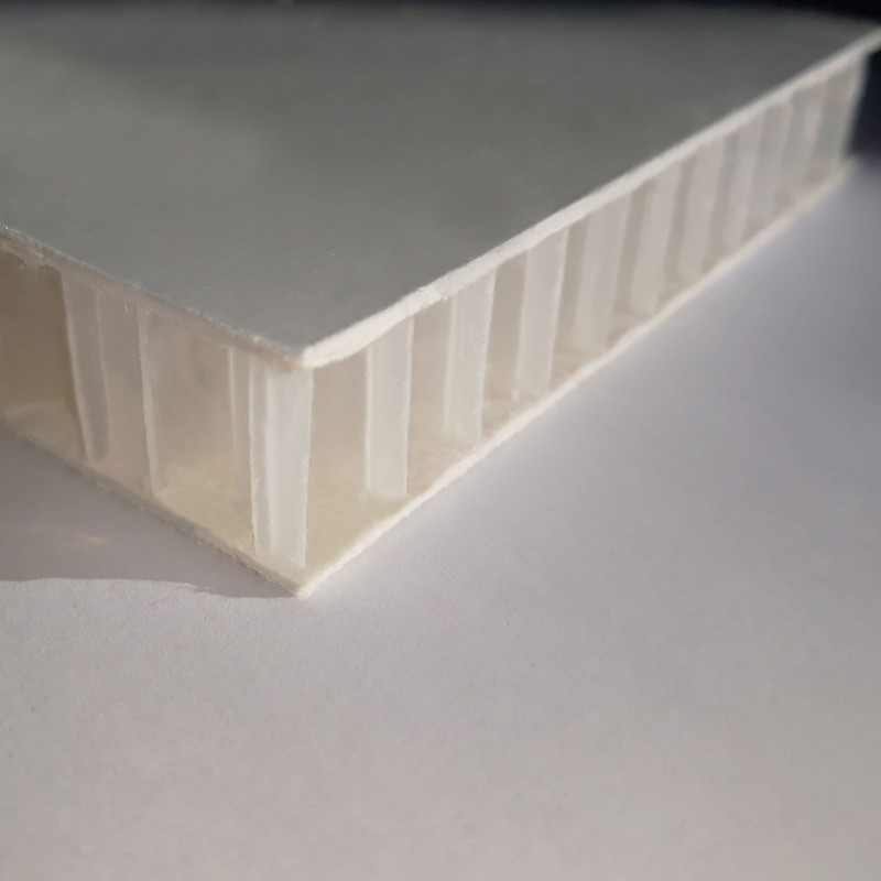 Panneau pour cellule de fourgon grand volume. Panneau allégé avec âme polypropylène à mailles de type nid d'abeille, revêtement 2 faces gelcoat blanc, résine polyester renforcée en fibres de verre. Ep.17mm x h.2150mm x l.4200mm